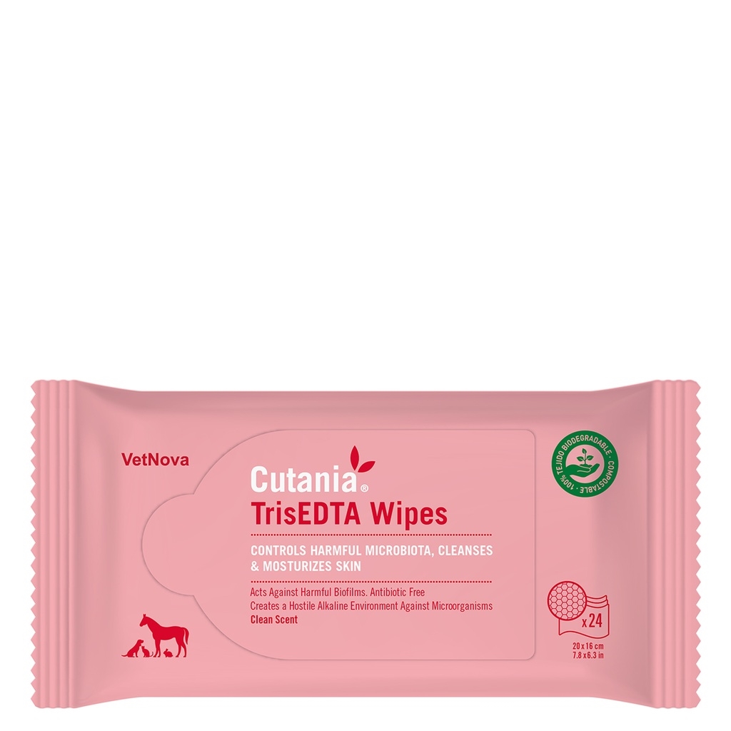 CUTANIA® TrisEDTA Wipes er dermatologiske vådservietter med alkaliserende og chelaterende virkning til kæledyr og heste.
